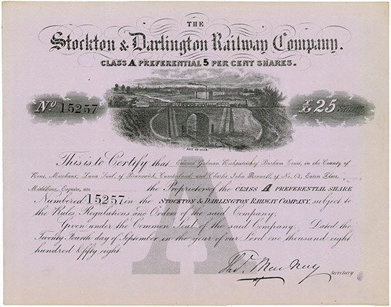 A share of the world's first steam locomotive railway! On his travels buying and selling wool, Edward Pease, a rich wool merchant, came to the conclusion that there was a great need for a railroad with waggons drawn by horses to carry coal from the collieries of West Durham to the port of Stockton. In 1821 Pease and a group of businessmen formed the Stockton & Darlington Railway Company with a capital of £120,000, most of this financing came from the Darlington area. On 19th April, the company was authorized to build a horse railway, but Pease was soon convinced by George Stephenson of the superiority of locomotives to horses. Pease asked and received permission from Parliament to make and erect locomotive or moveable engines. In 1823 Edward Pease joined the Robert Stephenson & Co. company which was solely aimed at the production of locomotives. The first railway locomotive, Locomotion, was finished September 1825 and on 27th September it pulled 36 waggons filled with coal and flour, guests and workmen. The initial journey of just under 9 miles took 2 hours, with a maximum speed of 15 mph (24 kph). At first only freight waggons were pulled by locomotives, passenger coaches were still horsedrawn. By 1833, the Stockton and Darlington had become entirely steam-operated, and proved a huge financial success. Meanwhile, it was an example for many other railways, such as the Liverpool and Manchester Railway. The Stockton & Darlington Railway was absorbed into the North Eastern Railway in 1863, which merged into the London and North Eastern Railway in 1922. Much of the original railway is still operating today.